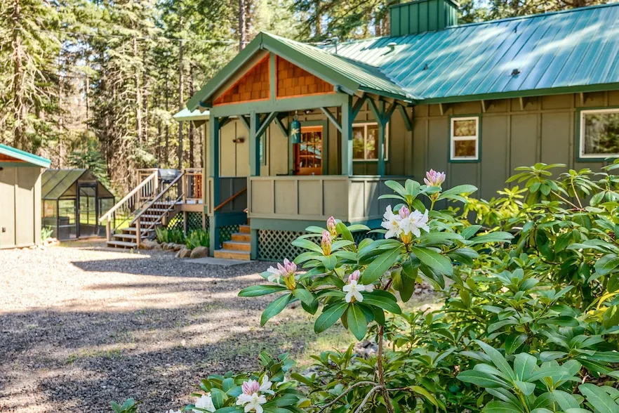 Beautiful mountain home on over 5 acres that backs to the National Monument. Nestled amongst native trees, the sense of peace and privacy is immediate. The front porch welcomes guests as they enter the open floor plan. Crafted with timbers from the property, the vaulted wood ceilings are a highlight. The kitchen has solid maple cabinets and overlooks the greenhouse. The living area is graced with a beautiful fireplace constructed with rocks from the local quarry. A bank of picture windows provides an abundance of natural light and brings the outdoors in. The sunroom off the living area is a perfect place for morning coffee or evening meals. The main bedroom enjoys a deck overlooking the forest and a second bedroom is great for guests. The loft is a flexible space that could be used as a bedroom, office or media room. Outdoors is beautifully maintained with several outbuildings, including a greenhouse, shop/storage, pumphouse and oversized carport. Truly the best in mountain living.