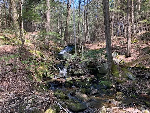 The property is at approximately 800 feet elevation in the western hills of the Lake George watershed. The land is flat at the access from the town road and around the house location. As one travels further west into the property, the grade increases slightly, and Huddle Brook emerges onto the property from the north. Beyond the brook, the grade gradually increases, and there is a small sugarbush at the propertys western boundary. The property is bordered to the south by an attractive beaver pond. Closer to the house and main road frontage, there are maintained fields along the northern boundary, flanked by old stone walls.