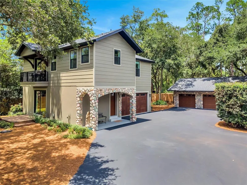 Enter into this meticulously crafted home offering an exceptional design throughout. Situated on a serene 1/3-acre lot, this property blends privacy with low-maintenance living. Enjoy the peaceful ambiance of a tree-lined street and picturesque lakefront estates just across the way. The xeriscape landscaping provides stunning curb appeal with minimal upkeep, while mature trees and plants provide privacy and seclusion. Inside, the flexible floorplan shines—featuring a downstairs ensuite with kitchenette bar, walk-in closet, full bath, and private deck. Perfect for a home office, guest suite, or in-law quarters. Interior laundry room. Upstairs, accessible via elevator or stairs, you'll find the main living area, a spacious owner's suite, and a third bedroom and bath. Step onto the balcony to take in partial lake views and breathtaking sunsets.