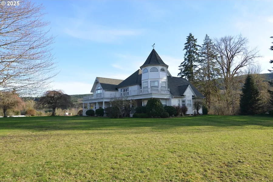 Stunning Victorian Estate on 20.55 waterfront acres! Luxurious residence boasting 5487 SF, 4 bedrooms, 3 bathrooms, Great Room living w/9' coffered ceilings, frml living rm w/FR doors to large patio. frml dining rm, gourmet oak kitchen w/replica stove/oven-island w/eating bar, immense family rm w/wet bar-Fr doors to viewing decks-FP, spacious primary bdrm-jetted tub-walk-in closet, heat pump & 4 car garage. The manicured grounds feature a gated entry-2 rail fence-creek frontage-pond w/covered bridge, 2740 SF shop w/kitchen-half bath-720 SF awning-144 SF porch, a 2350 SF shop w/half bath utility rm- 12,000 lb car lift & 720 SF RV carport w/hook-ups. The 2 shops are on a separate .54 acre commercial parcel.