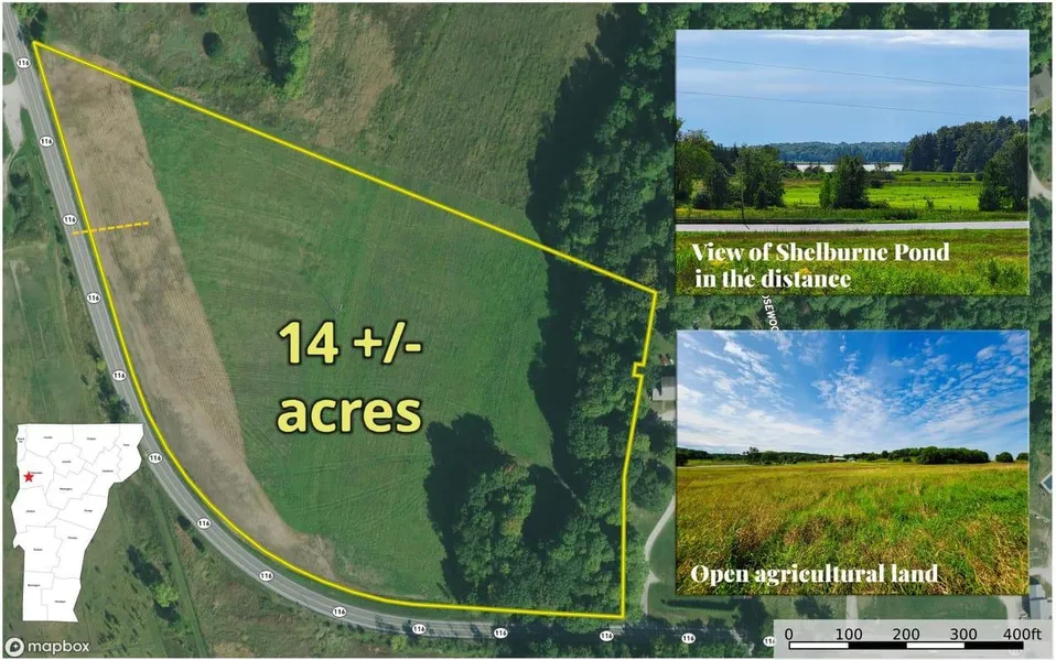 Wonderful 14 +/- acre Shelburne, Vermont land offering. Gently sloping open farm field that looks across the road to an establish riding stable and open fields. The southeast of the property provides views of Shelburne Pond. Residential power crosses the property and highspeed internet is available at pole across the street. Septic soil testing was completed in August 2023 with results showing a highly likely 4-bedroom residential mound system. Hinesburg Road is a state maintained, paved, year-round road. The seller previously applied and was approved for an access curb cut. Reapplication will be required. Located right on the Shelburne/Williston town line, the property is only minutes from all major shopping in Willison, the Burlington airport, and the University of Vermont Medical Center. Come explore the property and see it will fill the needs of your agricultural or residential use. Enrolled in Vermont Current Use tax reduction.
