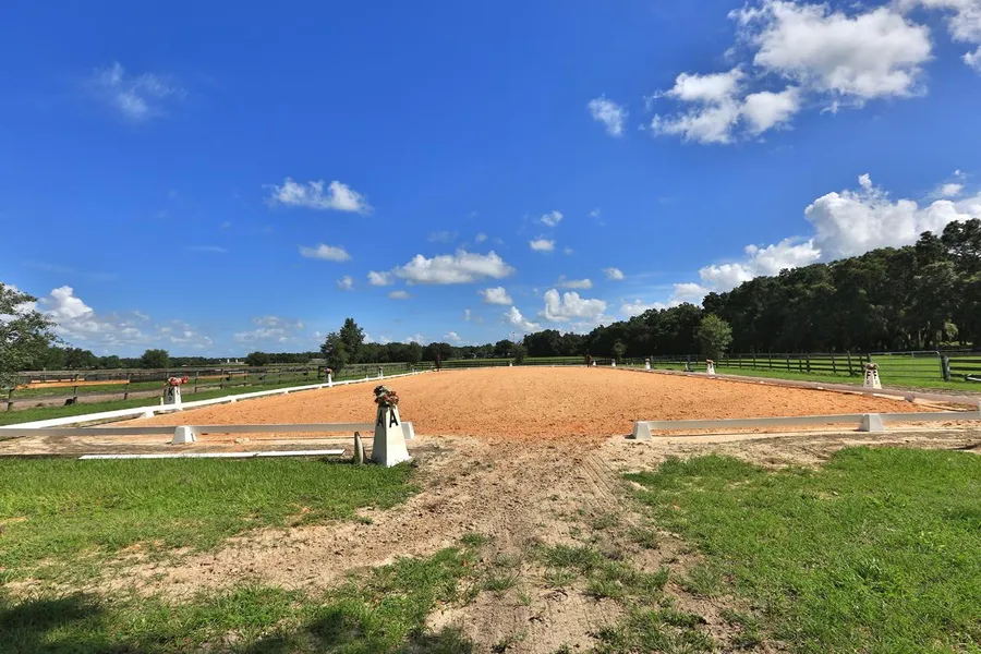 14 +/- Acre equestrian farm conveniently located between Ocala and the Villages plus just minutes to the Florida Horse Park. As you drive up the tree lined drive you will notice the lit polo field and lush green paddocks. You arrive at the center aisle barn 10-stall barn with tack room, feed room, and hay storage area. There are seven feed stalls under the shed row. The covered shed rows are large enough to park your horse trailer and equipment. Your guests or employees will enjoy the two 1 bedroom/ 1 bath apartments. As you continue on you will notice the 80 x 225 riding arena plus the additional paddocks for a total of 9 various sized paddocks graced with granddaddy oaks and lush green grass on the farm. Property is fenced with 4 board fencing. No deed restrictions so you are allowed to have horses, cattle, or chickens. This property is perfect for any discipline of horses. Exquisite location - The Florida Greenways and Trails are just a short 5 minute drive and The Villages just a short distance also.