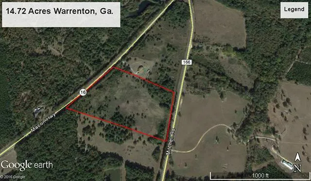 Research Parcel InformationFrom Augusta take I-20 west to the Camak exit. Take Highway 80 south to red light in Warrenton(intersection of Highway 80 and 278). Go straight at red light onto Warrenton bypass until you reach intersection of Highway 16 (four way stop sign). Turn left onto Highway 16 and go about 3 miles to intersection of 16 and Mitchell Road. Tract is located just past Mitchell Road on Highway 16.