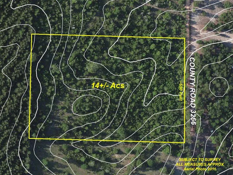 A partially wooded property featuring mostly younger pine and some hardwoods, interesting hilly terrain, sandy soils, and good County Road 3266 frontage. This tract has a nice potential hilltop homesite, approximately 650 feet of county road frontage and electricity and community water are available.