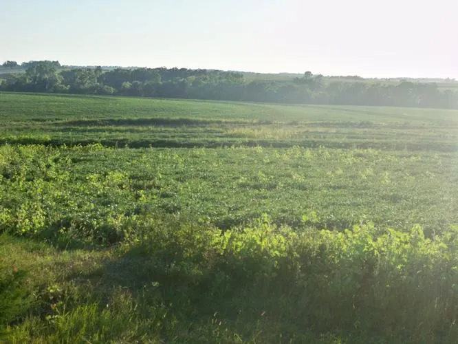 There are about 65 acres gently sloping, terraced cropland located on the west side of the farm, with the rest of the farm being good native grass and waterways. The native grass is presently hay meadow. The native grass has several timbered areas and ponds. There is a good 20x80 open front building and two upright silos near the south road.