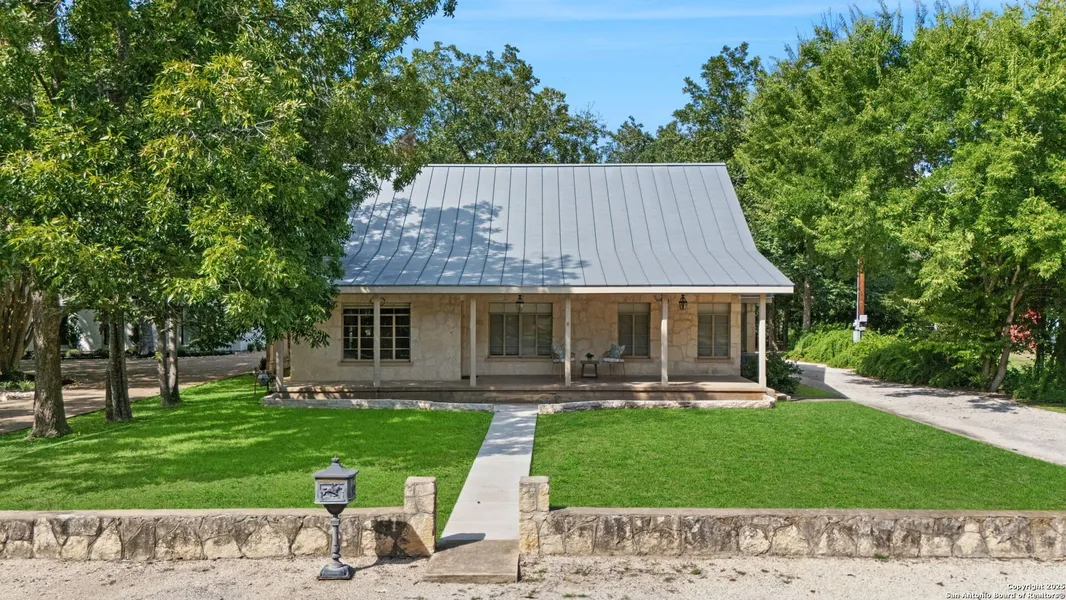 Riverside Mid-Century Retreat in Castroville. Experience timeless charm in this recently renovated mid-century stone cottage, perfectly positioned on .72 acres with 75 feet of serene Medina River frontage. Whether you're kayaking from your backyard or relaxing beneath the canopy of majestic bald cypress and pecan trees, this property offers a rare blend of privacy, nature, and convenience.,A wide front porch welcomes you into the home, while multiple patios extend your living space outdoors-including a breathtaking riverfront patio surrounded by lush liriope that bursts into purple blooms each year. Inside, the light-filled living area features a striking stone fireplace with gas logs, a cozy dining nook, and a spacious chef's kitchen complete with a custom bar, pendant lighting, and countertops crafted from century-old barn wood. French doors frame vibrant views of the property, while refinished dark hardwood floors provide a rich contrast to the bright, airy interiors. Three generously sized bedrooms share an oversized bath with a walk-in shower and convenient washer/dryer closet, creating a comfortable and functional layout. Additional features include a detached two-car garage with a secondary utility room, a private well for irrigation, and recent extensive updates. Just a short walk from historic Castroville's charming shops, wine bars, and community park-and only a 25-minute drive to San Antonio-this riverfront retreat perfectly balances small-town charm with modern convenience.