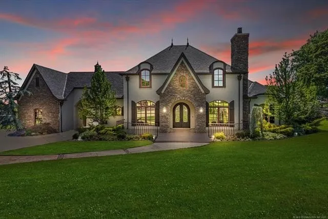This luxurious property boasts 4 bedrooms, with 2 located downstairs and 2 upstairs, 3 car garage with 2 car attached and 1 detached, porte cochère, and a stunning floor to ceiling stone fireplace with wooden beams. Additional features include an inground salt water pool, updated appliances, and 3 updated HVAC units. Situated in a cul de sac gated subdivision, this property also offers a 100” screen in the theatre room, circle drive, and a new roof with a 45 year transferable warranty. With too many amenities to list, this property is a must see. Bixby schools, luxury living, elegance.