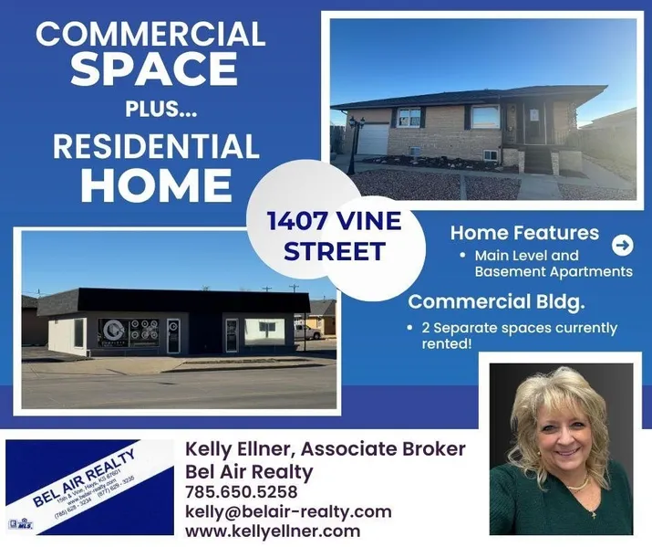 Don’t miss this chance to own a Vine Street property that includes both a residential and a commercial space!! Use it as an investment and rent out both for income or live in the house and lease the commercial property to help with payments. Ideally located near churches, shopping, and restaurants, the commercial space is already leased. The home boasts a formal living room and family room on the main floor, a main-level utility room, 5 bedrooms, and 2.5 bathrooms, with neutral décor throughout. Enjoy an enclosed deck, (hot tub condition unknown -sold “as-is”) and a fenced backyard. The basement includes a kitchen with a range\oven and refrigerator, both included in the sale. The garage measures 13’ x 36’, and there’s plenty of off-street parking for the commercial property. Taxes are for both properties. Contact Kelly Ellner at 785-650-5258 to schedule a tour..