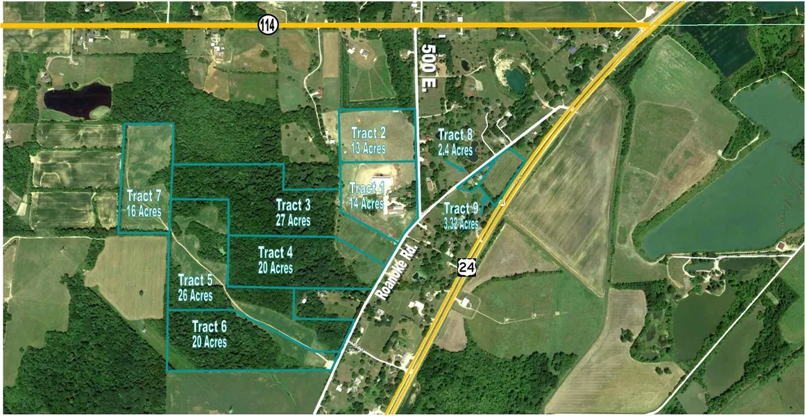Tract 8: 2.4+/- Acres Homestead on Roanoke Road! ATTENTION FLIPPERS, INVESTORS OR BUILDERS! This Cape Cod Style Home is in need of significant repairs to turn back to a beautiful homestead or could be a great location for a potential new build!! Current home has 3 Bedrooms, 1.5 Baths, Attached Garage and an Outbuilding! 11735 N. Roanoke Rd., Roanoke, IN 46783