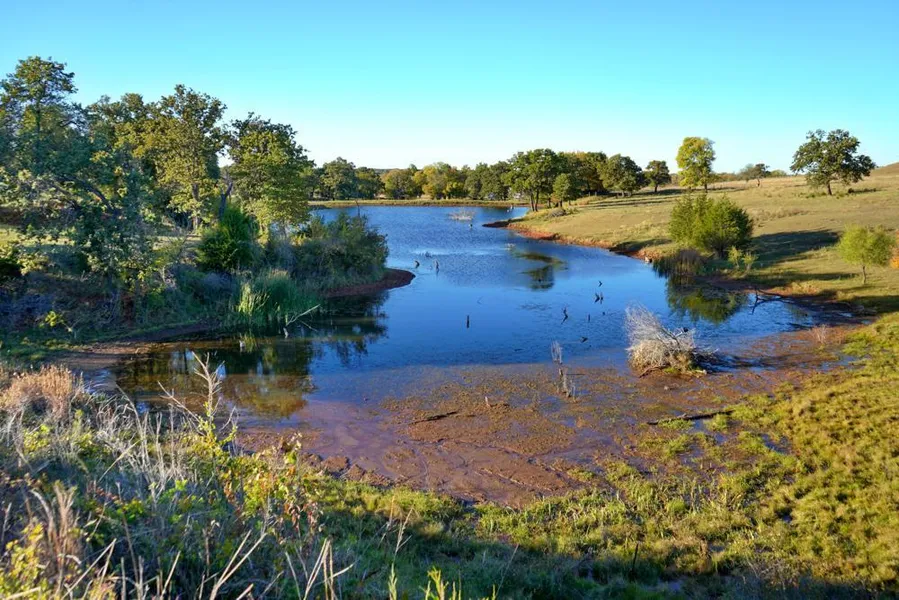 This farm is fenced and cross-fenced with a combined total of 10 acres of surface water. There have been multiple pine trees planted and the bases protected throughout the property. The 2 larger bodies of water consist of a 6-acre pond and a little larger than a 2.5-acre pond. Both of these larger ponds are stocked with the ability to pull out trophy bass or crappie. Several banded ducks and geese have been harvested from the permanent duck blind built on the larger pond. While watching the amazing Oklahoma sunsets, your ears will ring with an Oklahoma turkey gobbling in the pastures. The whitetail and turkeys run freely along Dibble Creek area bottoms and throughout the hardwood draws, providing a chance to chase either with great success.