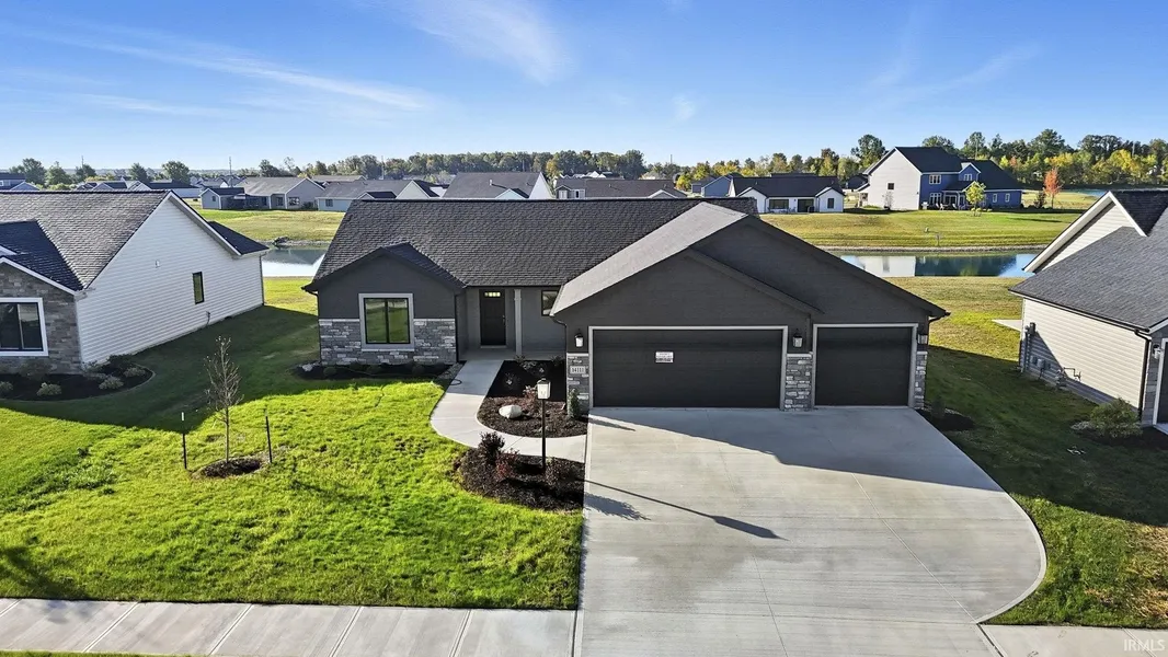 Check out this beautiful new split-bedroom ranch home for sale by Granite Ridge Builders in Southwest Fort Wayne overlooking a pond. This lovely home features an open-concept living area, perfect for entertaining guests or spending quality time with family. The kitchen boasts a stylish 7-foot island and a breakfast bar with quartz countertops, as well as a large pantry for all your storage needs. The great room has cathedral ceilings and large picture windows that let in plenty of natural light. The primary suite is a peaceful retreat with a private bath that includes a 5-foot vanity, a large shower, a linen closet, and a spacious walk-in closet. The garage is painted, trimmed and has a hybrid polymer floor coating. Other features: covered rear veranda, 3 car garage, Andersen High performance windows, tankless water heater.