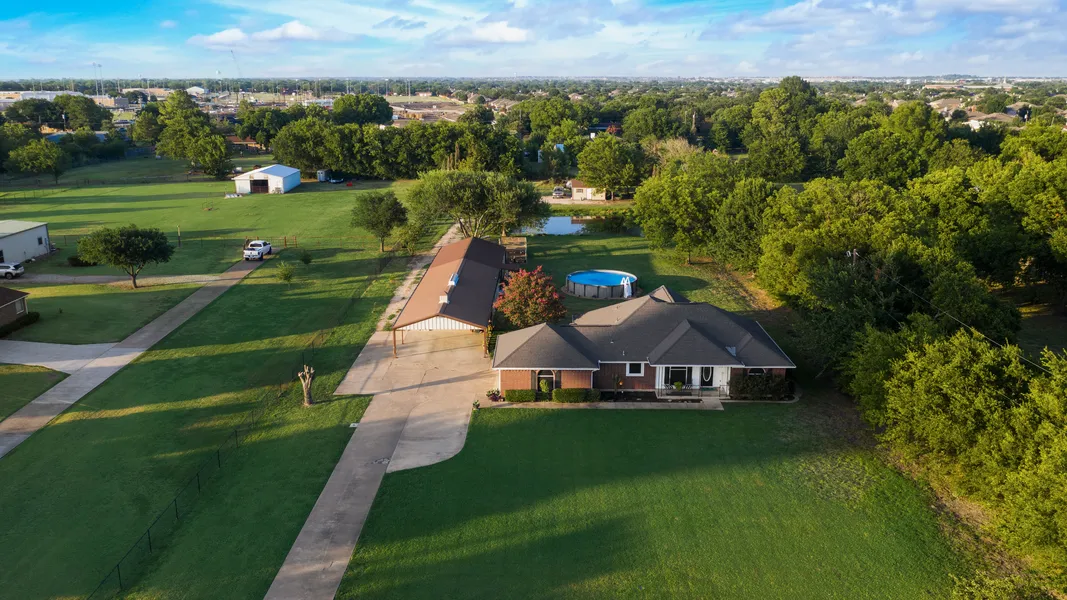 TWO roofs situated on this unique multi-family property. NO HOA, outside of city limits, yet close to shopping & restaurants with easy access to both I20 & Hwy 80. Sitting on TWO manicured ACRES, this property truly makes you feel like you are experiencing country living, all while being in the heart of Forney! The beautifully updated main dwelling includes 3 bedrooms, 2 bathrooms, a utility room, and a spacious screened in back porch where you can hang out with friends as they enjoy the 26' Crown Pool and firepit. The impeccable guest quarters offer 2 large bedrooms, 2 bathrooms, open concept living and kitchen complete with granite countertops & stainless-steel appliances. Your guests can step out onto their private porch and sip their coffee while taking in the gorgeous views of the private pond. An attached workshop, complete with insulation and central air-heat boasts an additional 648 sq.ft complete with a 24x24' covered carport. This property has everything you could want &more!