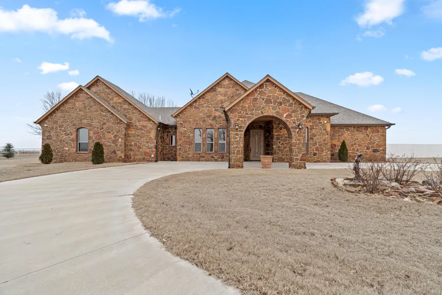 Welcome to this stunning custom-built home, thoughtfully designed to offer both spacious interiors and expansive outdoor living. The property boasts a range of exceptional features, including Bose surround sound, custom Knotty Alder wood cabinetry, level 6 granite countertops, a security system with eight cameras, and energy-efficient spray foam insulation. The master closet also includes an oversized storm shelter/safe room for added peace of mind. Enjoy a large bonus room with a bar area, perfect for a man cave, game room, or additional bedroom. Set on 5 acres, the property includes a 60x40 shop with 210/220 electrical wiring and two 12x12 doors. And, don't miss the 42-foot poolideal for soaking in the breathtaking sunrises and sunsets.
