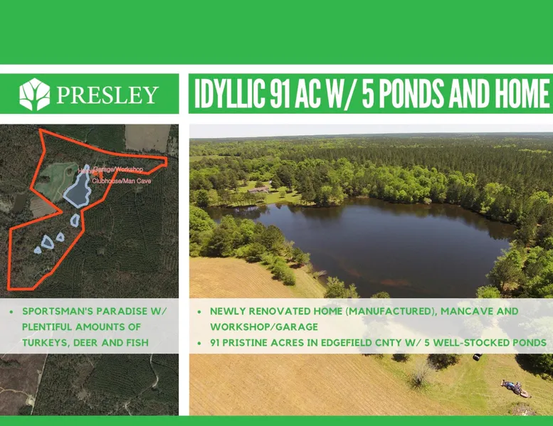 This beautiful 91 acre tract features the home, five separate well-stocked ponds, plentiful hardwoods, agricultural acreage, and an abundance of wildlife. Potentially great uses for the property include use as a scenic homestead for the homeowner seeking quiet, rural paradise, or as a recreational/hunting/fishing retreat. As you drive into the property from Long Cane Rd., you immediately see the home (manufactured) with layers of custom upgrades, overlooking the property's largest pond. Next to the home are two structures: The garage/workshed with room for multiple cars, ATVs and workshop space; and the "man cave"/closed-in picnic area with wood oven and plenty of room for social hangouts also overlooking the large pond. As you continue through the property via its various winding dirt roads, you are taken by the large pond, past the farming acreage back sequentially towards each of the four other ponds.
