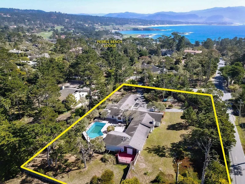 Fantastic location in the coveted Lodge, area of Pebble Beach. The home faces south and is sited on a corner lot with approximately 1.33 acres of flat usable land, affording the opportunity to expand. The single-level midcentury ranch is versatile in design and light-filled with 4146 square feet of livable space, four ample bedrooms, four full bathrooms, a large four-car garage, and a swimming pool. The home also includes a large family room and a den, both with fireplaces as well as a laundry room and a pantry. The existing layout is well designed and versatile enough to reimagine. The location is a dream, it is just a short trip to The Pebble Beach Lodge, iconic golf courses, links, and for the horse enthusiast, it is also near the Pebble Beach Equestrian Center.
