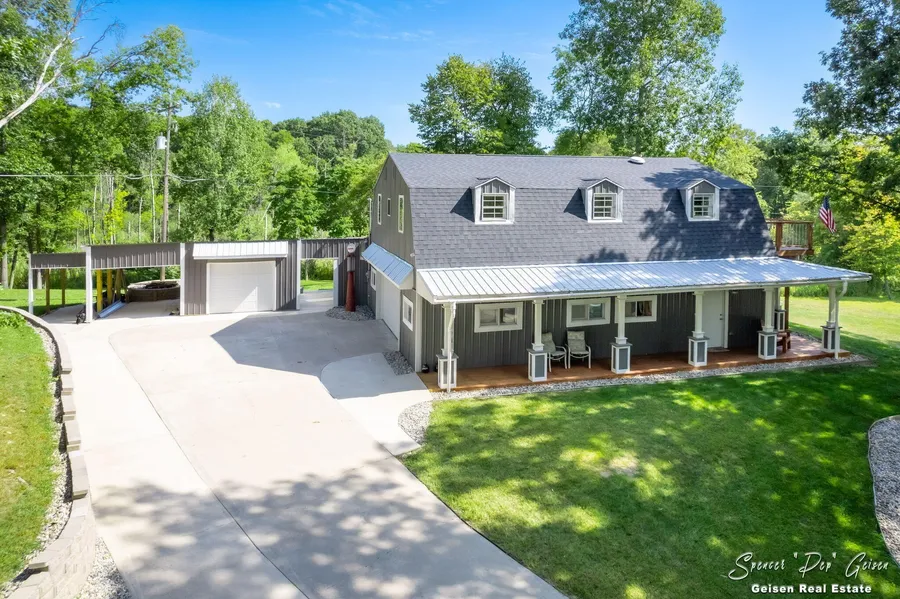 Located on ''the edge'' of the City of Greenville on a 6 acre parcel with a path thru the woods to your private ''bridge'' putting you onto the 6.5 mile Fred Meijer Flat River Trail, is this 2-3 bedroom, 1.5 bath, 1995 Barndominium offering an estimated 1,760 sq' of finished living area. Many ''cool features'' including: 2+ car attached garage with half bath and laundry, custom attached storage shed/workshop with overhead door and N&S service doors, adjacent to a small carport/covered storage area, inground sprinkling system and new roof 9/9/25. The main level has a either a family area with wood stove or the option to have the 3rd bedroom finished with a $5000 allowance offered by the seller in the list price. Upper level hosts the primary living area with kitchen and dining, 2 bedrooms and full bath and sliders to the southern exposure 10x20 balcony deck overlooking your natural place called home!!