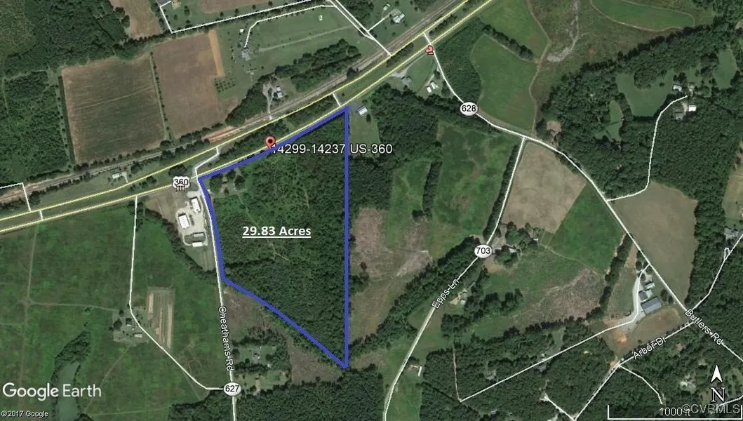 COMMERCIAL POTENTIAL on US 360 Corridor! 29.58 acre CORNER Parcel at intersection of US Highway 360 and SR627 (Cheathams Rd) in eastern Amelia County just outside of Richmond and Chesterfield County. Excellent Highway access and a great location for multi-business buildings for office, retail, or other commercial uses. Convenient to Amelia and only 5 miles to Chesterfield County line. 1155 feet of highway road frontage on the East bound lane of US 360, as well as, a potential second highway crossover access. Additional 728 feet of road frontage on SR 627. Attractive two story brick house built in 1967 could possibly be converted to business or office use. Commercial uses will require rezoning approval from Amelia County.