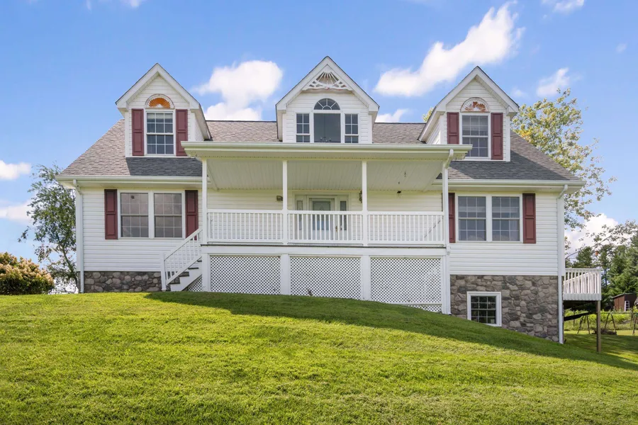 Breathtaking mountain and countryside views surround this spacious Cape Cod just 1.5 miles to Virginia Tech! With 3 bedrooms and 3.5 baths, this home is designed for comfort and function. The main level offers a primary suite with walk-in closet, large kitchen, dining area, living room, laundry, and access to a deck perfect for entertaining. Upstairs, two generously sized bedrooms each feature dual closets and share a full bath. The finished lower level includes a recreation room, theater setup with surround sound, full bath, and additional storage. Enjoy a maintenance-free exterior with a Trex front porch, dual-zoned heat pump, and ample space inside and out. Set on just over an acre, the property showcases mature pear, apple, peach, and plum trees with beautiful yard space for gardening, play, or relaxation. A true blend of convenience, views, and livability close to town yet private enough to feel like your own retreat.