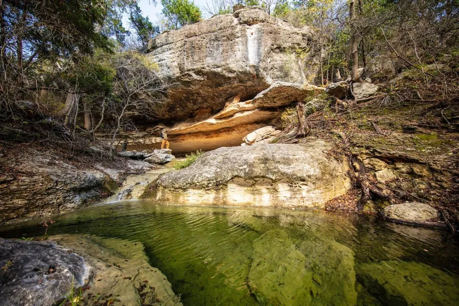 TERRAIN: Ranging in elevations from ~420' near the Brazos River at the southeast property corner to ~ 655' at the northwest property corner, a total of ~ 235' of overall elevation change occurs across the ranch. The land is marked by scenic plateaus, points, and ridges as they transition into valleys and draws along seasonal drainages and flowing streams. A rock rim lines the southeast part of the property and overlooks a deep canyon below where Cedar Creek has carved its way to the Brazos River over 1,000's of years, creating some of the most unique geologic features you will find anywhere. There are crystal clear pools where waterfalls seasonally spill off the top of the rim plunging into the limestone beneath and have over time weathered out multiple pools that stair step to the bottom, massive boulders that guard entry into river waterway, and the most significant and awe inspiring of all, a towering rock shelter overhang. It's difficult to put into words the enormity of the natural cavern that has been created here where Cedar Creek makes its last bend before reaching the Brazos. We see these in the area occasionally, but not nearly to this magnitude as it easily spans over 100 yards (a football field) in length, is approximately 60' deep at its widest point, and from floor to ceiling measures roughly 4 stories in height. It is truly a site you must see to appreciate.
