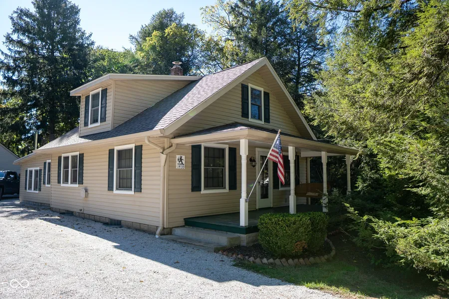 Charming Home with Workshop & Garden Setting! This home blends comfort, craftsmanship, and character! Nestled on almost a half-acre lot with mature trees and a serene garden-like setting, this home offers both privacy and personality. Step inside to find a completely remodeled kitchen featuring Miller Made cherry custom cabinets*, modern finishes, and plenty of space for cooking and entertaining. The home also includes newer siding, Pella windows, and shutters, plus updated wiring, outlets, and lighting for peace of mind and energy efficiency. Enjoy a cozy great room complete with a Vermont Casting wood stove, perfect for chilly Indiana evenings. A dedicated office provides flexibility for working from home or could easily be converted to a 3rd BR. While the primary suite opens to a charming walkout roof area overlooking the back yard and patio.-a lovely spot for evening relaxation. The detached garage is a hobbyist's dream, boasting an added 20x24 shop extension with attic space and pot-bellied stove for heat, and window A/C for year-round comfort. The unfinished basement offers endless possibilities for storage or a home gym. This one-of-a-kind property combines modern updates with timeless charm-ready to welcome you home.