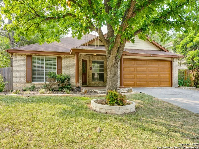 Offering Lender Credit with Preferred Lender! Beautiful brick one-story home located in the small gated community of Thousand Oaks Forest. Enjoy the shade of a majestic oak tree from the spacious front porch before stepping inside to wood floors flowing through the open living and dining area. The large island kitchen features a smooth cooktop, built-in microwave, and matching refrigerator, and opens to a bright breakfast nook and expansive freshly painted to neutral color large family room. The private primary suite at the rear of the home offers double vanities, a garden tub, and a separate shower. Step outside to a gorgeous covered patio with lush landscaping, stone walkways, and a storage shed. Additional highlights include ceiling fans, water softener, and new roof in 2018, new HVAC in 2020.