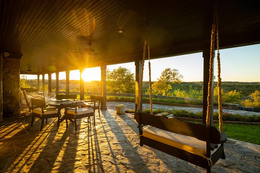 The covered porches surround the house, and most are at least 16 feet wide providing plenty of space to look out over the vast countryside from this hilltop. All of the patios and porches have stone flooring as well, and the upstairs sleeping porch is screened. The house is fenced with custom iron fencing and stone paths and gardens with irrigation for beds and lawn. Stone steps lead from the back of the house through large, terraced gardens to the swimming pool, cantilevered out.