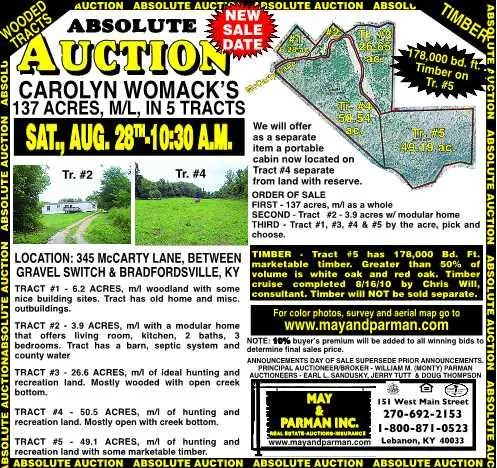 Absolute Auction 137 Acres M/L. with Modular Home, Saturday August 28,2010 at 10:30am. Located 345 McCarty Lane in Gravel Switch KY.