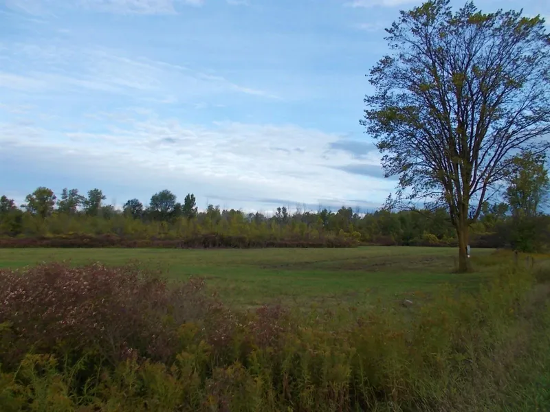 Woods are pretty thick in alot of places. Comprised of mostly poplars, maples, and dead ash. Theres a partial opening up front, about 10 acres worth, that the seller mowed some of this summer. The mowed area is now a glowing green patch of new grass. Good spot for your camp, or food plot. The deer seem to be enjoying that new grass now. The woods are mostly lower ground, mixed with some areas of grass and brush. Its not all underwater, but will be squishy to splashy in quite a few spots depending on the time of year. The very west end of the property does seem to be drier and has a few hardwood trees.