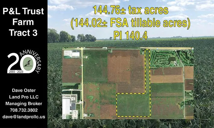 The P&L Trust Farm (Tract 3) consists of 144.76 tax acres of high-quality Class A soils (Drummer, Flanagan, Catlin, Harpster predominant soils). The farm is in Section 22 of Hall Township (T.16N.-R.11E.) in Bureau County, and is annexed to Spring Valley, Illinois. There are no buildings, and the farm lease is open for 2024.