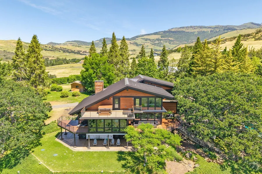 A private retreat setting where nature meets luxurious living. The 5BR/5BA Contemporary home captures the Siskiyou mtn range at every turn. The main level offers floor to ceiling windows, hardwood floors, living & dining room & Chef's kitchen appointed w/ island, wet bar, pantry, double ovens, wolf stove & more! Upstairs the main bedroom suite is an oasis unto itself w/views, decking & spa. A second primary suite, 2 add'l bedrooms/bath & laundry room w/abundant storage are downstairs. Each room has custom finishes & exquisite views to ensure a lifestyle of privacy & relaxation. Outside you're met w/soothing soundscape of a tiered cascading creek, lagoon waterfall style pool, cabana area, outdoor kitchen & bath, for ease of entertaining. Equestrian, livestock or agricultural enthusiasts will delight w/the endless possibilities. Fruit trees, garden beds, greenhouses, chicken coop & workout room complete this singular estate. 1BD/1BA guest apartment is a bonus to this luxe property.