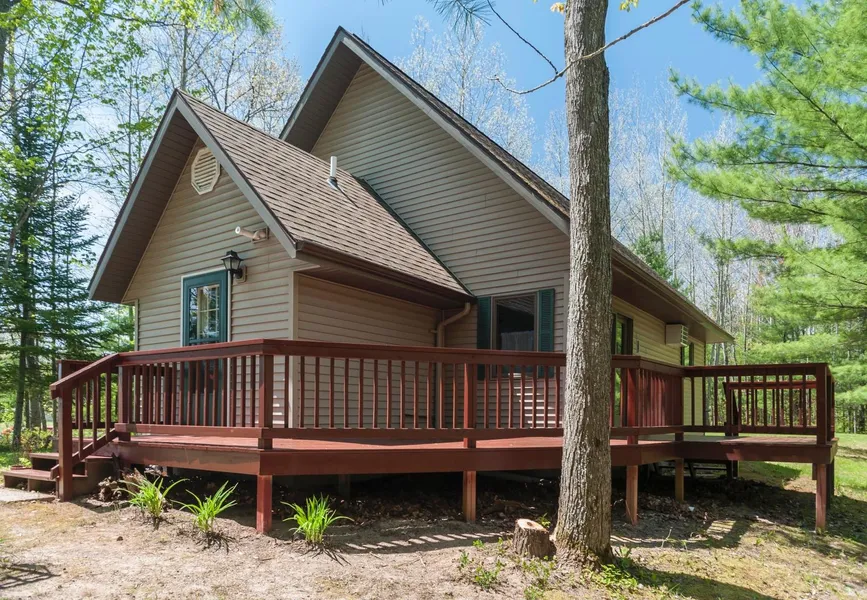 CUSTOM HOME ON 65 ACRES - mio, well crafted 3 bd, 2 ba, with beautiful hardwood floors, cathedral ceiling, 3 bedroom loft, oak kitchen cabinets, wrap around deck, great up north setting with a lot of trails winding through the property, home is well crafted and well kept, with the Ausable and Camp 10 Bridge just a short distance away along with the Amish community $ 199,900 A-2496