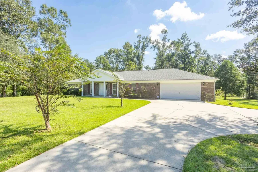 AMAZING ALL BRICK HOME, 3/2, ON FOUR PLUS ACRES WITH DETACHED METAL BARN AT THE END OF ITS' OWN PAVED DRIVE TO THE LEFT OF THE MAIN HOUSE!! RARE FIND!! This Home is a true country retreat with great privacy and ample grounds for anything desired! The home is a traditional look in style with additional paved parking area in front of the OVERSIZED two car garage! As you enter the home, you find a HUGE Great Room/Living Room space with River Rock GAS fireplace! The Master Bedroom Suite is to the right with private Bath featuring Separate Shower, Garden Tub, Water Closet, Walk-In Closet and Double Vanity with solid surface counters! The Kitchen/Dining Area is off the back of the Great Room including French Doors to the Covered Patio. The Kitchen is Wide Galley Style with HUGE Laundry Room beyond connecting to the garage. The two additional bedrooms are on the left side of the home, BOTH LARGE ROOMS, and Full Bath Between giving additional privacy to those spaces. The view from the back of the home is down a Vista with trees, grass space and providing a tranquil outdoor space to enjoy on any occasion! There is a paved drive to the left of the home, about 200ft north from the roadway that takes you to a LARGE metal barn at the back of the property. There is power and water supplied to this already. Perfect for a home based business or any purpose. There is a green space that is open from the barn area around to the opposite side of the property coming back up towards the home. The property is close to shopping on HWY 29 and easy access into all of Pensacola. This setup is not common so take the opportunity to see all this offers! Take the time to see the 3D Virtual Tour in the link provided above. (Buyer to verify all information to satisfaction)