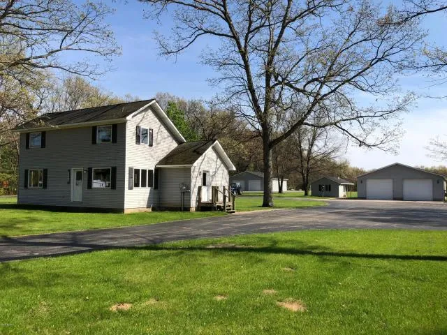 Well-built, well-maintained, one-owner 3-bedroom 1-bath home with beautiful wood floors and over 3 acres of land, a paved circle driveway, one enormous pole barn, a crazy-awesome sauna-suite and a deluxe 4-car garage with it's own kitchen, bathroom and bonus room. You truly have to see this one in person to appreciate the extras. Electric heat keeps this home easy to maintain. Andersen windows. Natural Gas boiler for the heated floors in the garage. And the pad in front is also heated! The garage also has A/C, a compressor that's hard-wired in, a flat-screen TV, 2 freezers, 2 beer fridges, a gas stove and a dishwasher. A total Man-Palace or Over-the-top She-Shed. There's also an enormous pole barn in back. And a Veggie Garden has electric for a fence and a pump for irrigation.