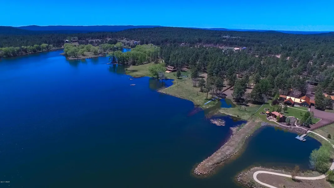 Paradise on Rainbow Lake! 3.76 pristine acres w/a back drop of the snow capped Wht. Mtns, 100's of ft of shoreline on peaceful Rainbow lake. Private inlet & 2 cascading water falls add to the exquisite setting. 30X16 Ramada,built in BBQ/Perilla Grill,gas fireplace & firepit for total enjoyment.Tastefully appointed 4 bd 3 ba + bonus rm in the main home opening to panoramic views to the east across the lake. Great room w/open kitchen includes professional gas range framed w/rock,split floor plan w/ a main lvl mstr bd.2 car attached garage & carport. Shop ''man cave''w/ elec w/2 elec garage doors & priv. guest quarters.Addl buildings include lrg equip shed, addl storage buildings + horse stable & turn outs. Solar gated & fenced on all sides except the lake.Has its own well w/ backup AZ water.