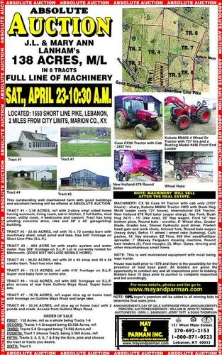 Coming Auction Saturday April 23, 2011 at 10:30 am. 145 Acre Farm M/L., in Tracts Plus Farm Machinery. Located at 1550 Shorline Pike Lebanon, KY.
