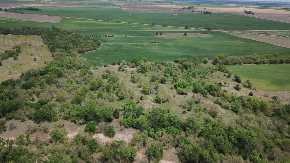 Having 146 +/- total acres and 90 of those in tillable farm ground with a local tenant willing to pay a premium rent of $45 per acre, this parcel and the way it lays out has so much to offer the avid outdoorsman and still provide a substantial revenue stream. The tillable farm ground is a long, east-west 90 +/- acre area that is split up by railroad tracks with cover on both sides of the tracks, a large stand of native grasses in the middle, and it is bordered along the entire south side by a wide, thick stand of mature timber. That area alone can provide hours of upland hunting to a couple of hunters and their dog. The 55 +/- acres on the west end of the property stretches from north to south for a half mile and includes a seasonal creek that feeds south into the Arkansas River and is thick with mature timber and cover, providing a great habitat for whitetail deer and roosts for the resident turkey population. The property is covered in deer sign, scrapes, rubs, and trails that cut across it in every direction.