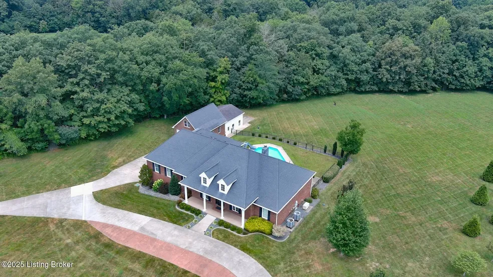 Discover your dream home on this magnificent 8.66-acre private estate, where luxury meets functionality in perfect harmony. This custom-built insulated concrete form home showcases superior construction quality and energy efficiency with thoughtful design throughout its five-bedroom, five-bathroom layout. As you enter the long circle driveway, you will know this home is truly special. The heart of this residence features a gourmet kitchen equipped with commercial sized refrigeration, elegant granite countertops, custom cabinetry and premium finishes that would make any chef smile. Rich hardwood floors flow seamlessly through the main living areas, creating warmth and sophistication. The great room that is conveniently open to the kitchen features a wood burning fireplace for those cozy evenings at home. This split bedroom floor plan ensures privacy, with the primary suite offering a spa-like retreat complete with an oversized walk-in shower, exceptional cabinetry and generous closet space. The main level also features 4 additional bedrooms for large families or family visits, as well as 2 additional flex spaces that would be perfect for a hobby room or office. The laundry room is located in the center of the home off the kitchen and was designed with cabinetry, closets and an abundance of space. The finished walkout basement expands your entertainment options with a gas fireplace, wet bar kitchen area, and flexible space for recreation or relaxation. Outdoor enthusiasts will appreciate the heated inground pool, while the screened porch provides the perfect spot for morning coffee or evening gatherings. Vehicle storage exceeds expectations with a three-car attached garage plus a remarkable four-car detached garage featuring a convenient loft space. This exceptional setup accommodates collections, workshops, or additional storage needs. Located in the desirable Auburn Hills Estates, you'll find convenient access to Hwy 313 and I-65, local shopping, and recreational facilities. The substantial acreage provides ultimate privacy while maintaining reasonable proximity to community amenities. This property represents a rare opportunity to own a meticulously crafted home where every detail has been considered for comfortable, luxurious living.