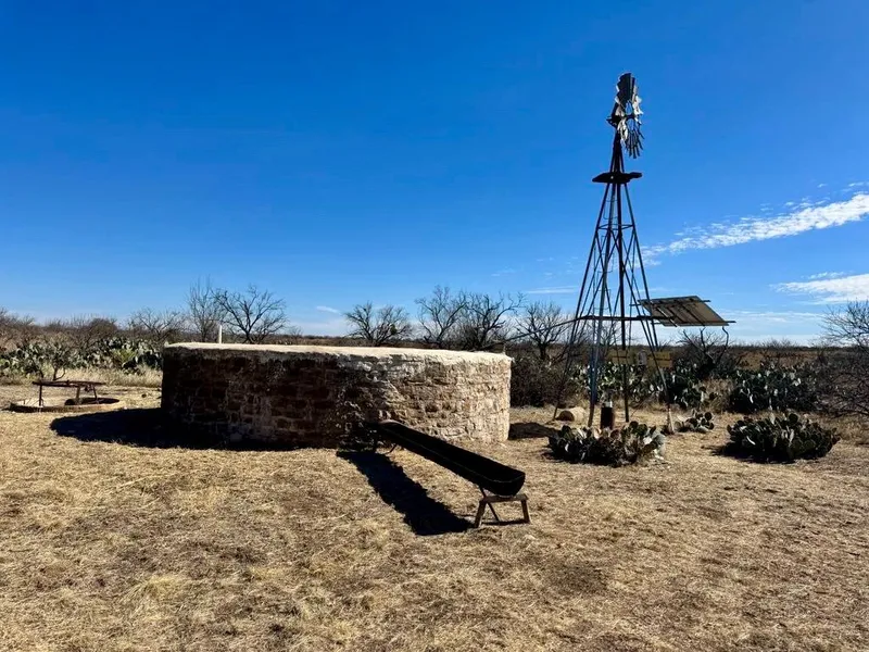 The property includes a water well, an old windmill, and a large cement water storage tank. The water well has recently been converted to a solar-powered system, featuring a new solar pump and four solar panels.