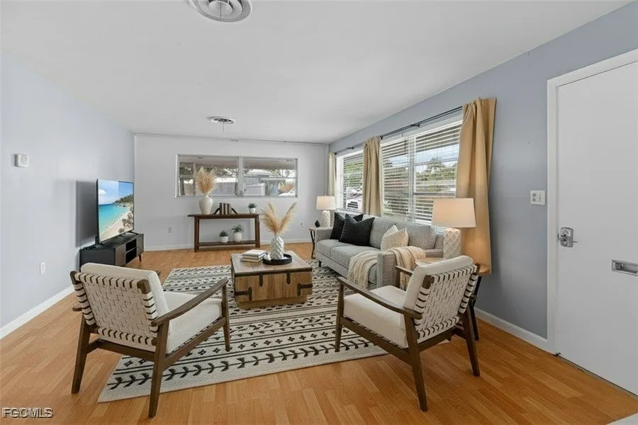 Location, location, location! Don't miss this charming up dated 2-bedroom + flex space home perfectly nestled near McGregor Blvd and Summerlin Rd - one of Fort Myers' most desirable neighborhoods. This charming home blends comfort, versatility & convenience - perfect for buyers looking to live or invest in Fort Myers! Virtual staging has been added to the living room and primary bedroom to help you envision the home's full potential. Features updated roof 2023, kitchen and baths, wood laminate flooring, and screened porch. Finished garage with sink, refrigerator, and 2 wall A/C units (no permits issued) offers rental income potential or can easily convert back to a garage-garage door remains. Wraparound 2-car carport, fruit trees, and convenient location near shopping, and dining. Finished garage falls under FHA guidelines but is not included in the Gross Living Area.