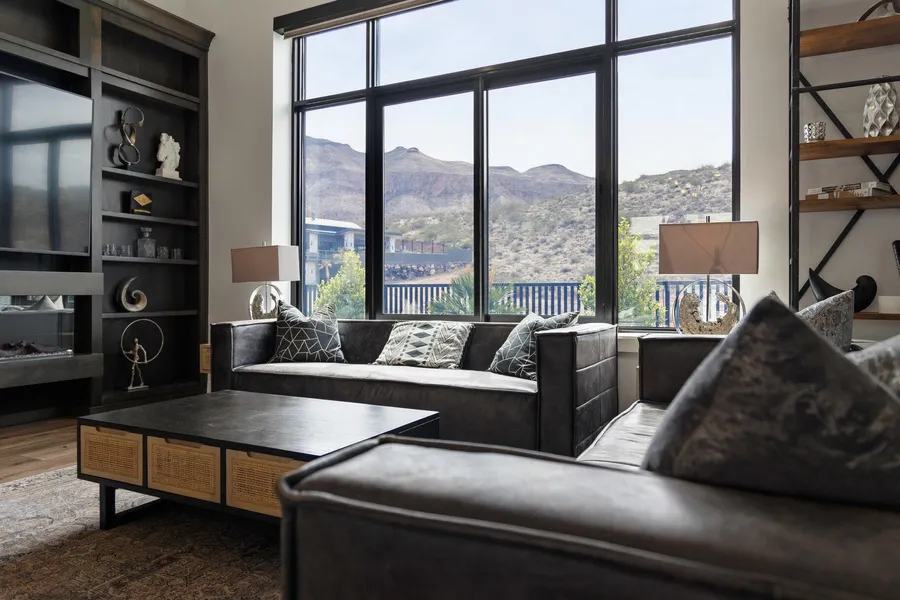 On the backdrop of the Copper Rock Championship Golf Course with stunning mountain views of the Hurricane Hills, Pine Valley, and the most stunning desert landscaping lies this modern-style short term rental home. Showcased as one of the homes in the 2022 Parade of Homes, this custom-built turnkey fully furnished stunner was designed for both aesthetic impact and practical living. Overall, the residence features 5 bedrooms, 5 bathrooms, 3 car garage (1,045 SqFt) with 14' ceilings and 10' bay door, over 50 solar panels with a power wall. The unique layout brings together a main residence and a guest house feel. The main house is 3 beds with 3 baths, and the detached guest house has 2 beds with 2 baths with a kitchen and living space. The main house includes a spacious great room that features 12' ceilings, large built-in entertainment center with a fireplace, tall windows, spectacular contemporary design light fixtures, large kitchen islands with Bianco Romano Granite countertop, Bertazzoni high-end Italian Appliances, two-tone cabinets, electronic blinds throughout, dedicated room-by-room mini split heating/cooling air conditioner units, exquisite tile, LVP, and carpet throughout, and all of the most amazing upgrades. The exterior space is designed to entertain and absorb the beauty of the surrounding landscape with features like an inground pool with shamu shelf, built-in BBQ, artificial turf, pergola, upper view deck with a hot tub above the main house, additional upper deck above the guest house, and so many more details. Constructed with Insulated Concrete Forms (ICF), the home boasts an impressive R-54 insulation rating, contributing to low utility costs and increased rental profitability.