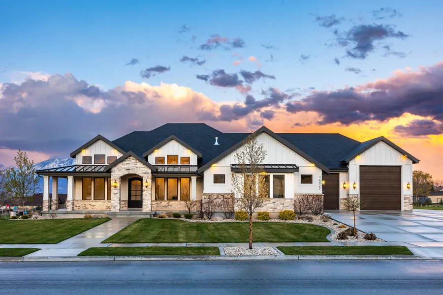 This stunning custom rambler boasts a gorgeous open floor plan that provides comfortable main-floor living. Upon entering, an office is situated off the front door, while a salon, a gourmet kitchen, and an extra-large primary suite await. The kitchen features a magnificent 12' granite island, custom cabinetry, and high-end Kitchen Aid appliances, including a built-in refrigerator, freezer, and pebble ice maker in the basement kitchen. The upstairs and downstairs areas each have their own stone gas fireplaces, complete with built-in bookshelves, and motorized blinds for the extra-tall windows that offer unbeatable views of the mountains. The whole house, garage, and exterior feature included speakers, as well as a massive 80" TV and a 60" TV that are included with the home. Downstairs, you'll find three bedrooms, a basement kitchen with high-end appliances and pebble-ice maker, a billiards room, a theater, and a Fort Knox safe room, as well as an adorable under-the-stairs playhouse. Just a couple of steps down from the mud room off the kitchen leads to an extra-large garage, which accommodates up to six cars and includes a 12' tall 37' deep RV garage with extra storage that is fully insulated. Additionally, the property has a 20' x 35' RV pad. The backyard is perfect for entertaining and relaxation, featuring a fully landscaped and spacious lawn with a gas fire pit, an 8-person hot tub, two trampolines, a tennis/basketball/pickleball court, and two water features. The lawn sprinklers use irrigation water, while the flower beds and house use culinary water. All in all, this is an incredible property that offers luxury, comfort, and endless entertainment possibilities.