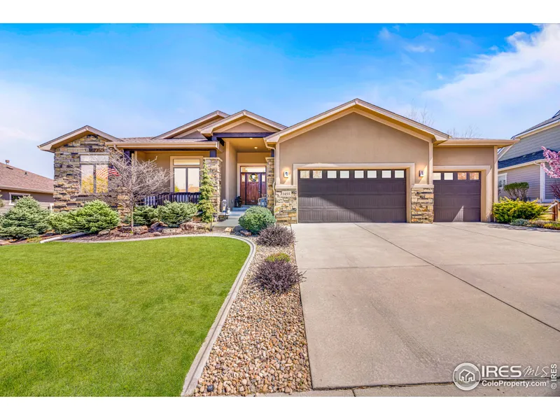 Welcome to 1455 Bison Run Dr-an exquisite Clark Street Custom Ranch nestled in the desirable Bison Ridge neighborhood. This thoughtfully designed home offers true main-floor living with an open, airy layout and high-end finishes throughout. Enjoy soaring ceilings, rich hickory hardwood floors, knotty alder trim, and abundant natural light. The gourmet kitchen boasts shaker-style cabinetry, granite countertops, a large island, and a walk-in pantry-perfect for everyday living and entertaining. The expansive primary suite features a spa-inspired bathroom with a soaking tub, walk-in shower, dual vanities, and laundry access. A dedicated main-floor office with custom built-ins offers flexibility as a 5th bedroom. The newly finished basement is an entertainer's dream with a custom wet bar, open living space, two additional large bedrooms, and a stylish full bath. Step outside to a beautifully landscaped backyard with fruit trees, a new patio, and a covered Trex deck ideal for evening relaxation. Complete with a spacious 3-car garage and modern amenities like CAT6 wiring, this home is a perfect blend of luxury, comfort, and function.