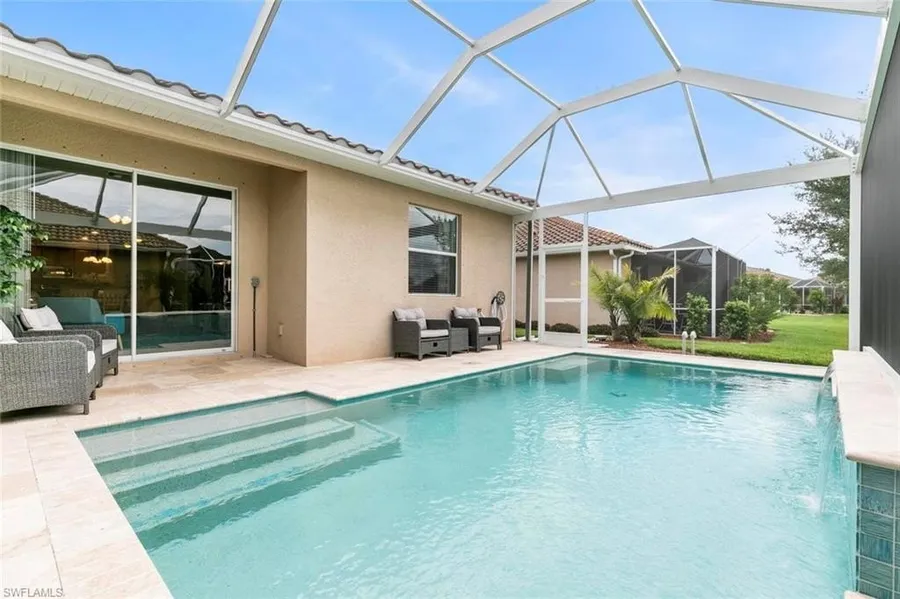Located in the highly coveted Reflection Lakes community, this stunning lakefront 3-bed, 2-bath villa perfectly blends style and functionality. Step inside to discover an open floor plan, highlighted by elegant crown molding and neutral tile flooring—a perfect blank slate ready for your personal touch. The highlight of this home is the spacious screened lanai, complete with a private pool installed in 2022, offering the perfect backdrop for outdoor relaxation or entertaining. Move right in as this home comes fully furnished with new, modern furniture, allowing you to embrace the relaxed Florida lifestyle from the moment you arrive. The chef-inspired kitchen is equipped with stainless steel appliances, granite countertops, a pantry, and an island—ideal for hosting family and friends. One of the guest bedrooms features a versatile Murphy bed system that seamlessly transforms into a desk, optimizing both space and functionality. Reflection Lakes boasts resort-style amenities including a sparkling pool and spa, a clubhouse, low HOA fees, and no CDD fees. But that’s not all! Its prime location puts you just minutes from pristine Gulf beaches, downtown Naples, and the iconic Naples Pier. Don't miss this rare opportunity to enjoy the best of the Florida lifestyle. Schedule your showing today and make this lakefront villa your new home!