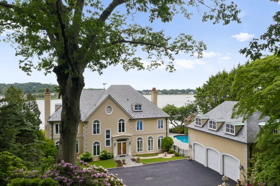 Spectacular Waterfront Country Residence set on a Private Acre overlooking 200 ft of Beachfront, offering a Retreat Lifestyle. Sophisticated entertaining spaces with uniquely designed features throughout this Manor Home. Floor to ceiling windows to optimize the incredible Water-Views, lush Landscaping, Private Beach, bluestonePatios, and sparkling heated Pool; Gourmet kitchen with breakfast alcove; Solarium; Library; spacious Primary suite and three additional bedrooms with baths. Huge attic for Storage; three car garage with loft for potential Gym, Office, Art Studio; Waterfront sports and Mooring.