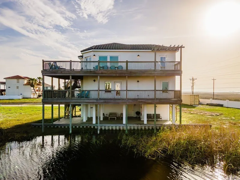 Welcome to your dream home! GORGEOUS VIEWS that you must see in person. Perfectly nestled on the serene shores of Mustang Island! This stunning beach front, lake front and expansive 2- story, 5-bedroom, 4.5-bathroom home combines luxury with relaxation in an idyllic coastal setting. This home is the PERFECT INVESTMENT PROPERTY that generates significant income every year and all existing reservations will convey. This home sits on a cul-de-sac with room for three cars in the garage. Step inside the reverse floor plan and be amazed by its open concept and breathtaking views of the ocean. The gourmet kitchen features stainless steel appliances, quartz countertops, and a spacious island perfect for entertaining. Outside, it truly shines with over 1600 square feet of outdoor living space, making the house the perfect home for anyone who loves the taking in the outdoors. Enjoy the two-story deck or enjoy the bottom level watching the sunset or catching crabs in the lake. Just a short stroll to the beach, this home offers the perfect blend of seclusion and convenience. Whether you're seeking a full-time residence or a vacation getaway, this house promises a lifestyle of unparalleled elegance. As a short-term rental many repeat guests enjoy making life-long memories year after year! Don't miss this rare opportunity to own a slice of paradise! House is being sold FULLY FURNISHED. The community pool off the beach walk is equipped with communal storage for all your beach gear. Short-term rentals are allowed- already established and successful rental book. Outdoor shower. Two garages with an unfinished room that you can add another bedroom and bathroom on the first floor, perfect to add your own touch to the home! Brand-new appliances convey including a new refrigerator, new water heater, dishwasher and new AC Plenum and Air Handler. Room to customize. Unfinished area on the first floor in between the garages with the possibility to add another bedroom, bathroom, or game room.