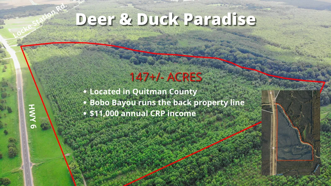 Are you looking for an income producing hunting property? If so, look no further then this property located in Quitman County Mississippi. This property has tons of potential, it has 2 riser pipes in place so it can be flooded to duck hunt, it also has lots of big deer! It is located in the flyway right off of Bobo Bayou! This property brings in nearly $11,000 annual CRP payment. IT is located less than 45 minutes from Oxford, and a little over 1 hour from Memphis Tn.