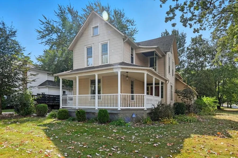 Step into timeless character with this beautifully maintained Galion home! Built in 1918, this two-story residence offers 1,671 sq. ft. with 4 bedrooms and 2.5 baths, including a spacious primary suite with a private bath and dressing area. The interior boasts rich wood detailing, high ceilings, and a stunning coffered dining room ceiling that adds architectural charm. The kitchen is a cook's dream with abundant cabinetry, a center island with sink, and a breakfast bar that's perfect for casual dining or entertaining. Natural light pours through the large wood-framed picture windows. Cozy evenings are made better by the wood-burning fireplace. Outside, enjoy multiple porches, a generous patio, and a 22x40 detached garage with loft for parking and storage. With its inviting curb appeal and blend of historic craftsmanship and modern comfort, this home is a rare in-town find.