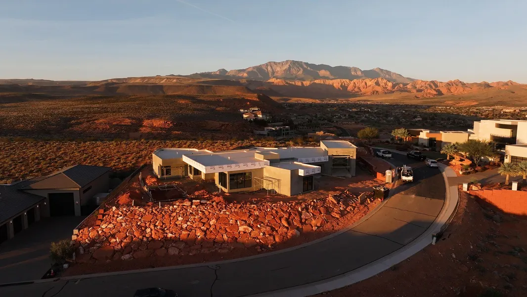 Perched near the top of the gated enclave- Westgate Hills, this single-level home takes in sweeping views of Pine Valley Mtn, sandstone cliffs, city lights & crimson ridges to the south. Set on a private 1/2-acre lot, it features a 43-ft RV garage w/12'x14' door, 3-car garage & RV pad. Outdoor living shines w/ heated pool, spa, waterfall feature, shamu shelf & auto cover. Inside: 5 beds (5th as office w/view), glass media room, private guest suite with incredible views, a chef's kitchen w/ custom cabinets, high-end countertops & appliances, large working pantry w/southern mountain views + an additional storage pantry. Primary retreat has a large window that perfectly captures Pine Valley Mtn views, has a spa-like bath & spacious closet w/ laundry hookups. Est. completion Jan 2026.