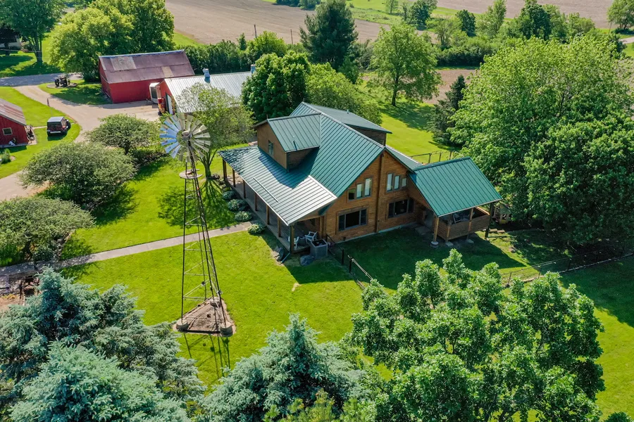 Located just north of Lake Summerset on 10 acres +/-, this property offers a perfect blend of country charm and modern amenities amidst rolling hills. As you enter the circle driveway, you’ll immediately notice the well-maintained log cabin, multiple outbuildings, and an inviting in-ground pool. Approaching the cabin, you’re greeted by a spacious wrap-around porch, perfect for entertaining, with an additional space at the rear of the home. Inside, an open floor plan with abundant natural light and hardwood floors welcomes you. The large family room seamlessly transitions into the eat-in kitchen, remodeled in 2021. This high-end kitchen features granite countertops, custom cabinets, and stainless steel appliances, including a Wolf stove with a pot filler, sub zero refrigerator, Cove dishwasher, and microwave drawer. The main floor hosts one bedroom and a full bathroom, which can also serve as an office with convenient access for visiting clients. An elegant open staircase leads to an oversized master bedroom upstairs, complete with its own full bathroom. The lower level offers a recreational/bar area, two additional bedrooms, and a full bathroom. The property’s appeal extends outdoors with a variety of functional spaces. A 48x52 outbuilding features concrete floors, two overhead doors, and a heater, while a second building serves as a workshop with concrete floors and a wood-burning stove. The in-ground saltwater pool (installed in 2017) is surrounded by pavers and a stone wall, complemented by a roofed bar area perfect for entertaining with its own grill. Despite its private setting, the property is conveniently located near town. Additional storage buildings and a chicken coop add to the property’s versatility. The land includes 3.5 acres of tillable ground, over 1 acre of open ground that can be farmed or used as pasture, and 1.25 acres of timber on the south side with a creek. Numerous updates over the years include the roof, windows, exterior staining, gutters, and mechanicals, making this property a truly exceptional find.