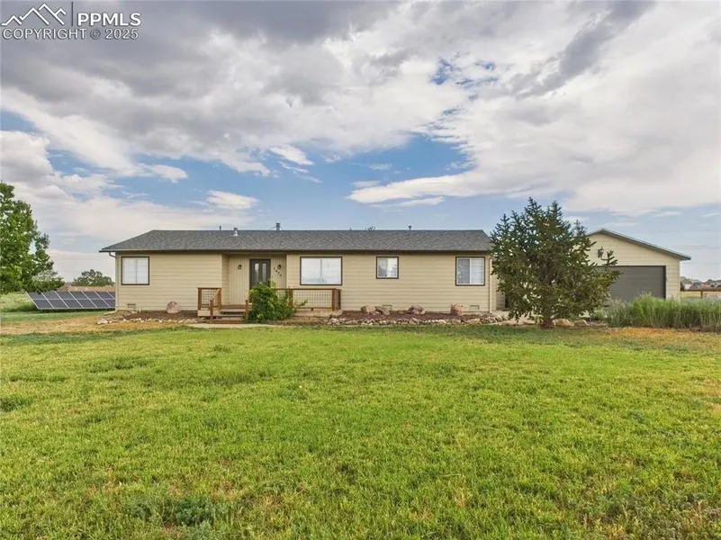 Welcome to this charming and spacious single-story home, offering 1426 square feet of comfortable living. This bright and functional floor plan features 3 bedrooms and 2 full bathrooms. Upon entering, you'll find a generous living room complete with a cozy wood-burning stove, direct access to the backyard, and extra space for various activities. The kitchen is a true highlight, boasting ample granite countertops, abundant cabinetry, and a convenient breakfast bar. A dedicated laundry room/mudroom adds practicality to your daily routine. The Primary Bedroom is a private retreat, featuring a walk-in closet and a luxurious full bathroom with an inlaid tile shower/tub combo. Step outside to enjoy the beautiful Colorado sunsets from the concrete patio, or utilize the already fenced-in shed to corral your horses. Additional features of this turnkey property include a detached 28x38 2-car garage, mature trees, paid-off solar panels, a new roof, a front deck, and new blinds throughout. Don't miss the opportunity to own this exceptional home, schedule a showing today!